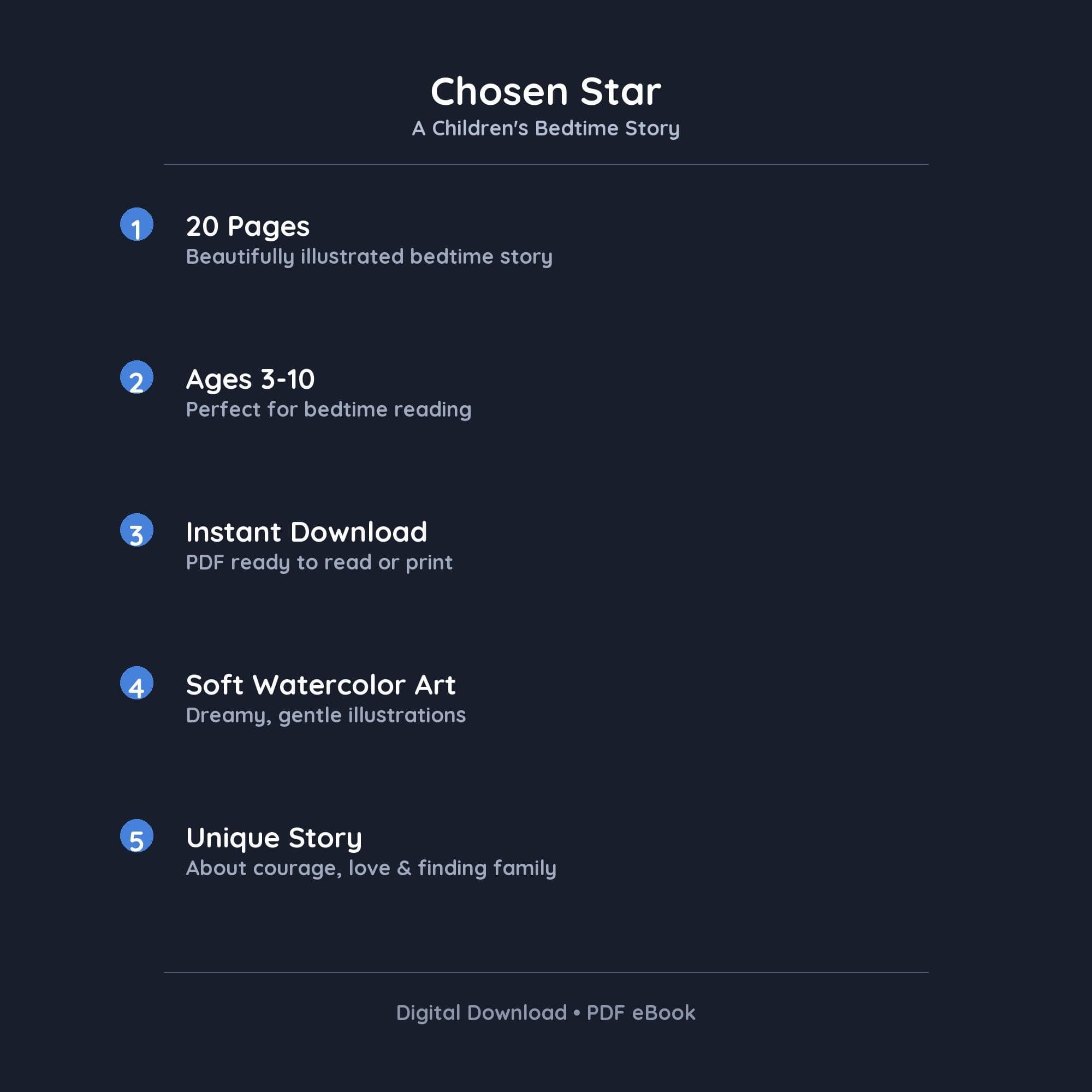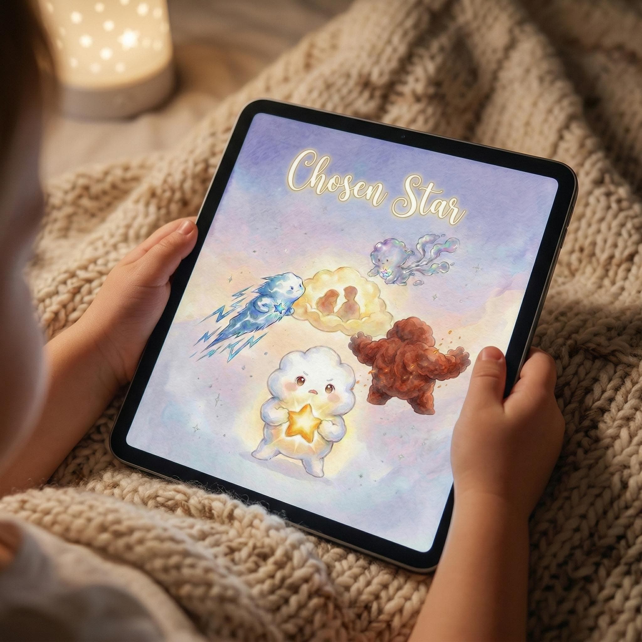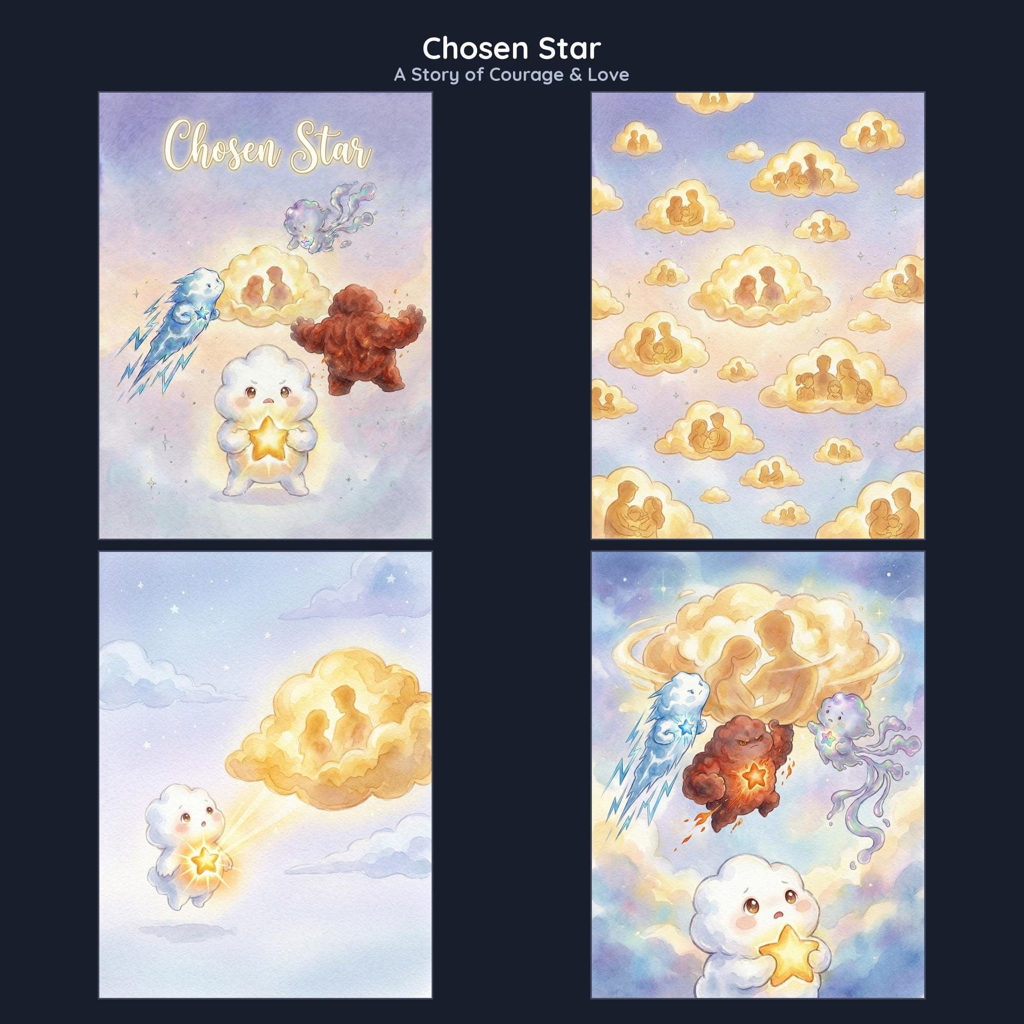 A heartwarming bedtime story told through a magical world of clouds and stars. 20 illustrated pages in soft watercolor style — themes of bravery, love, and belonging for ages 3–10. "You were the bravest little soul — and you chose us."