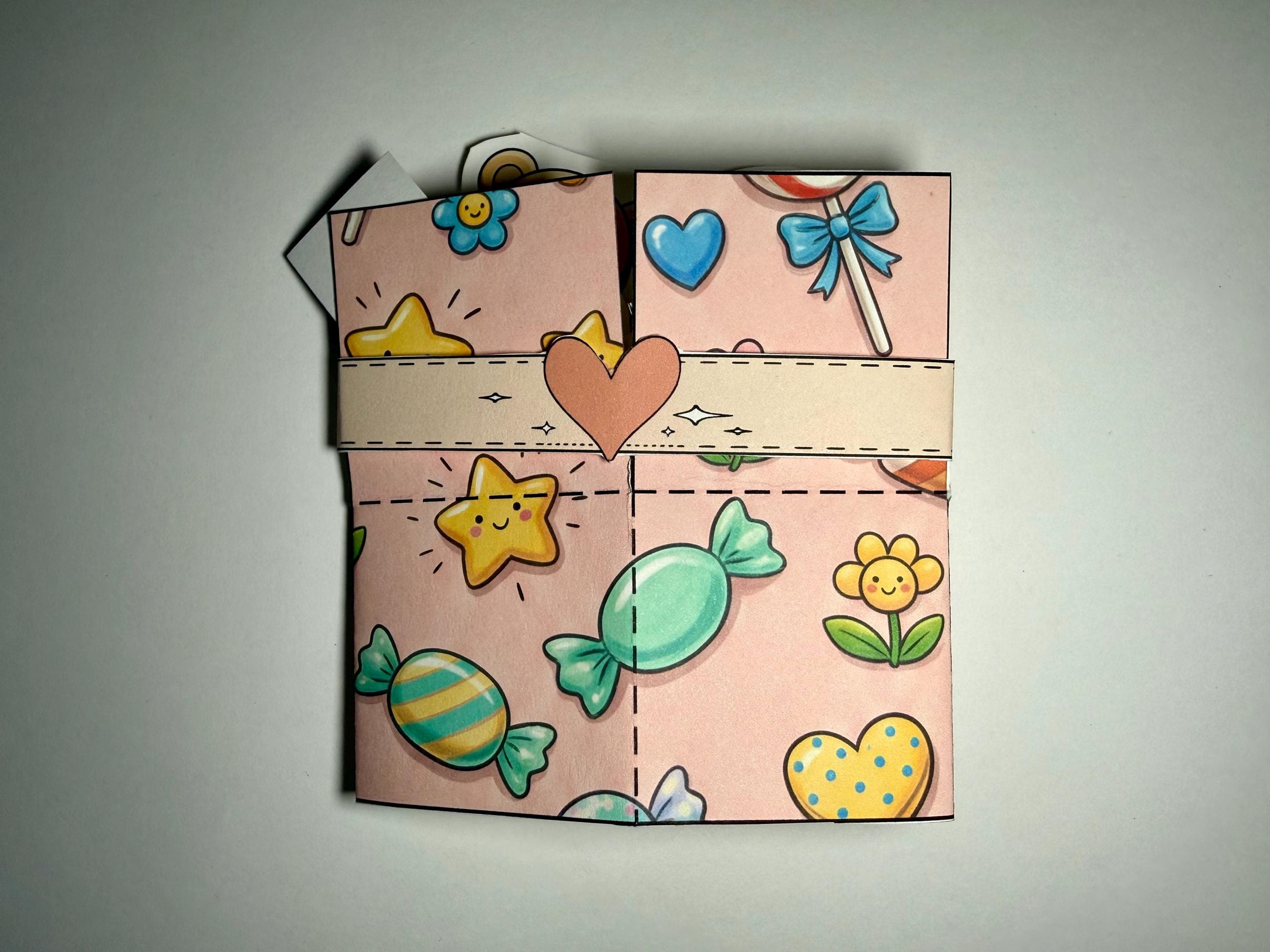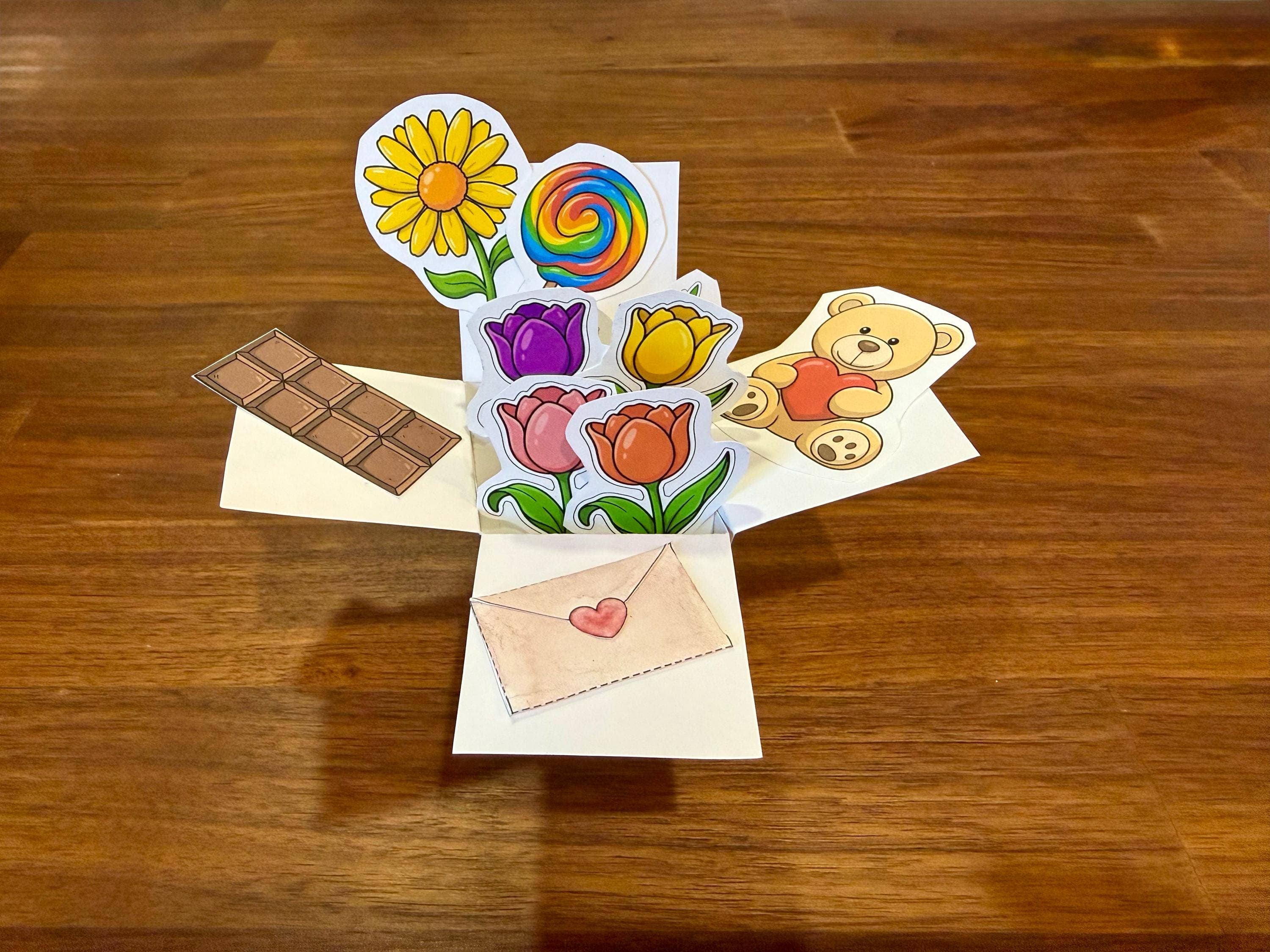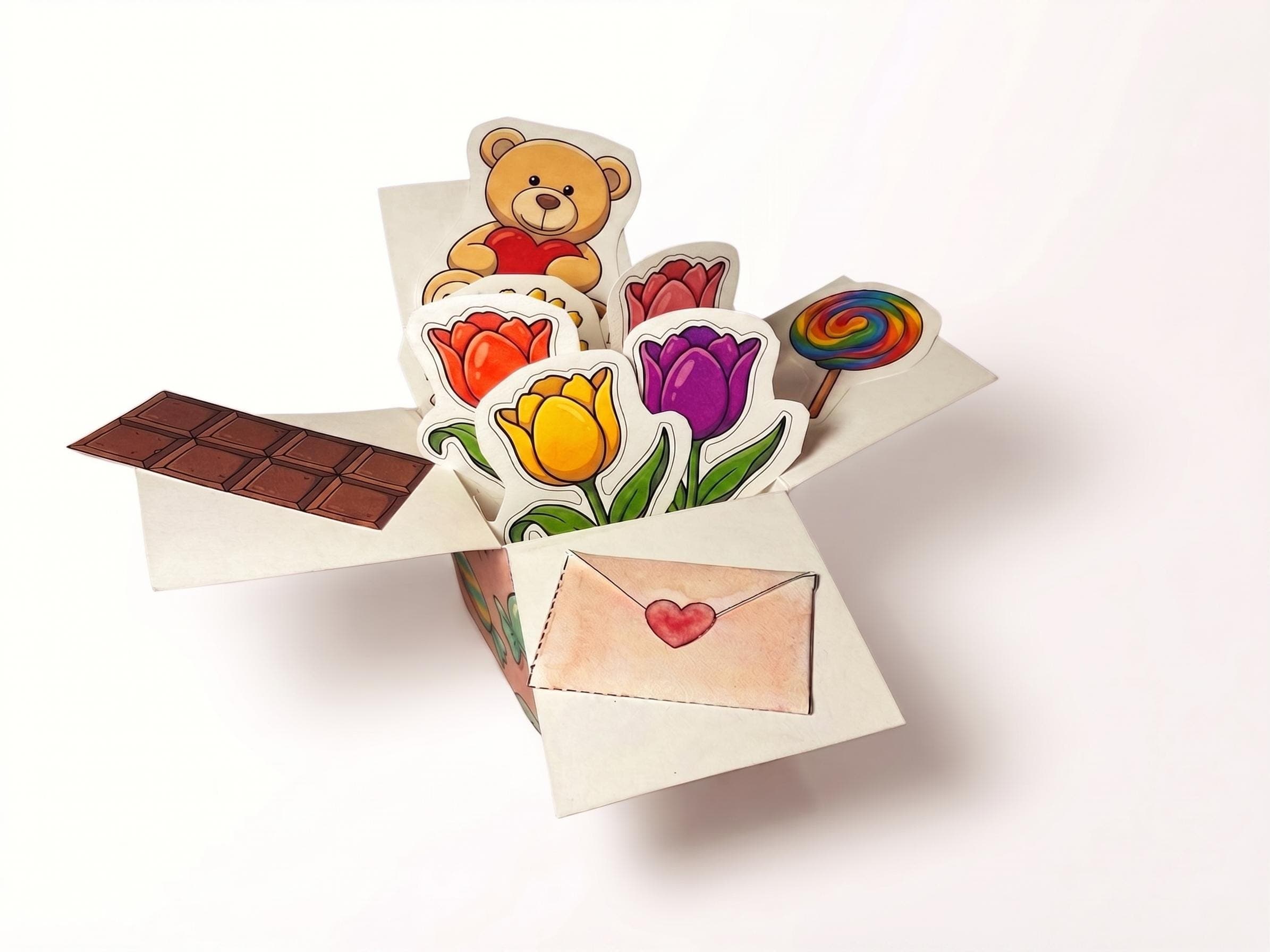 A heartfelt, hands-on way to say "I love you" — perfect for Mother's Day, Valentine's Day, birthdays, or any special occasion. Print, cut along solid lines, fold along dashed lines, glue, and arrange the decorative cutouts however you like. Needs thick cardstock or matte photo paper (200–300 gsm), scissors, and glue — no special tools. "A little surprise, made with love."