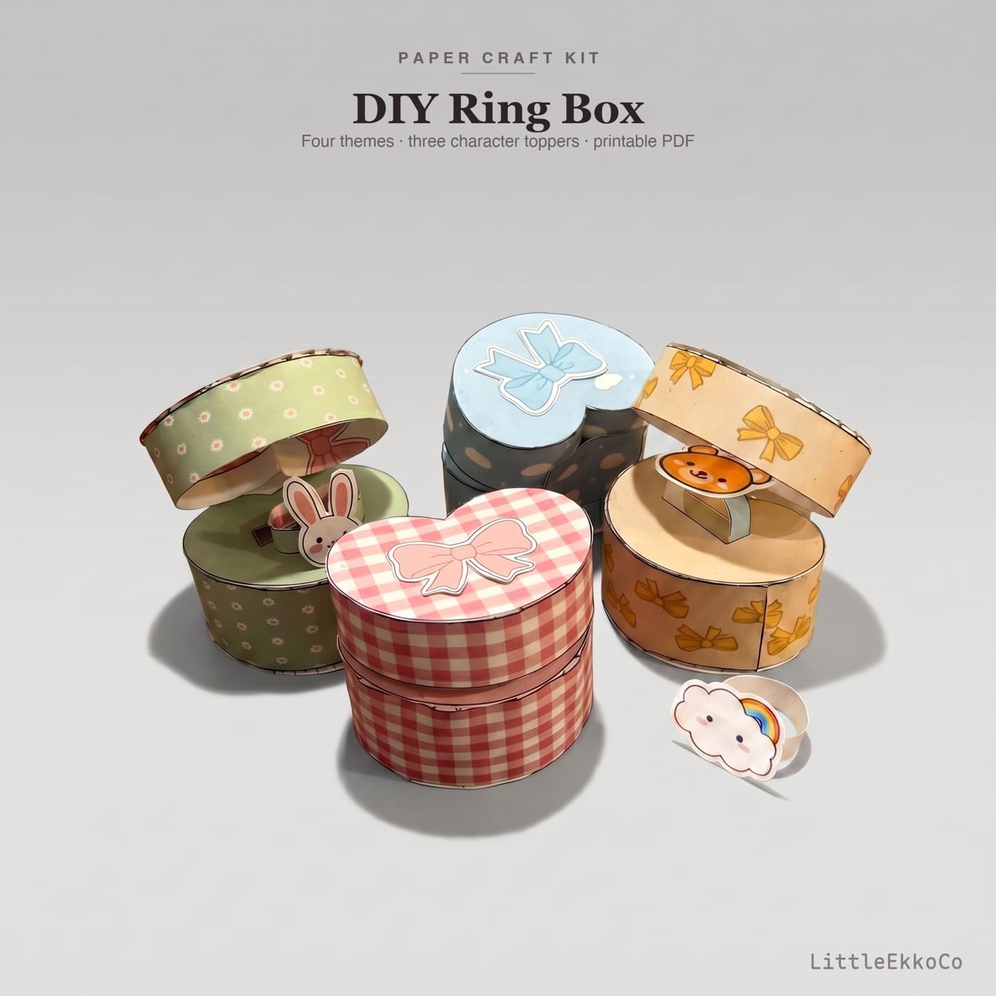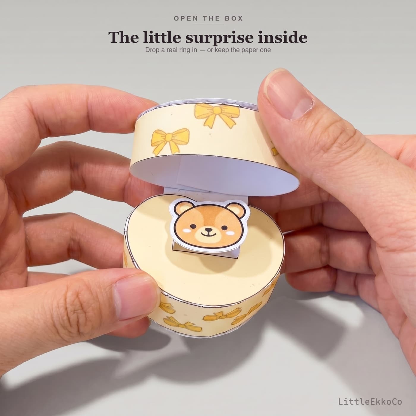 A sweet little handmade gift for Mother's Day, Valentine's Day, anniversaries, or any moment that calls for something personal. Print, cut along the solid lines, fold along the dashed lines, and glue — the heart-shaped box opens to reveal a pop-up holder cradling a paper ring topped with a tiny bear, bunny, or cat. Needs cardstock or matte photo paper (200–300 gsm), scissors, and glue. No special tools. "A small box. A small ring. A big feeling."