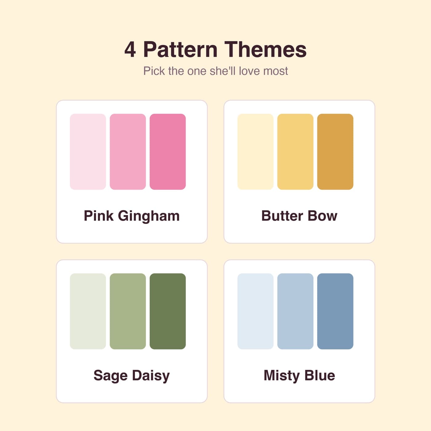 - 4 pattern themes — bow, gingham, sage, blue
